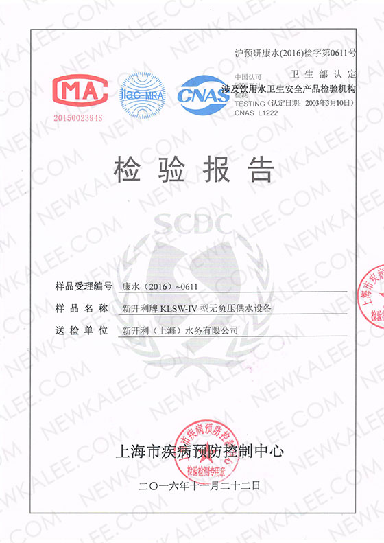 检验报告——新开利牌KLSW-IV型无负压供水设备
